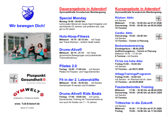 Die neuen Angebote für Fitness, Gymnastik, Kinderturnen und Gesundheitssport für das Frühjahr 2026 stehen fest. Weitere Informationen zu den Sportangeboten findet ihr unter Fitness oder Gesundheitssport.