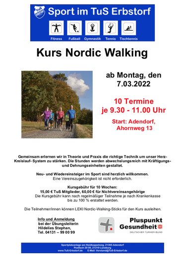 Der neue Nordic Walking-Kurs startet am Montag, 07.03.2022. Treffpunkt ist jeweils Ahornweg 13 in Adendorf. Der Flyer kann per Klick vergrößert werden. Weitere Infos finden Sie auch hier.