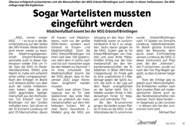 Fußball Jugend · 25. Juni 2023 NFV-Journal widmet unseren Mädchen-Teams eine ganze Seite. In der aktuellen Ausgabe des NFV-Journal wird über eine ganze Seite über den Mädchen-Fußball der MSG Erbstorf/Brietlingen berichtet. Fotos und der Bericht können per Klick vergrößert werden. tagPlaceholderTags: