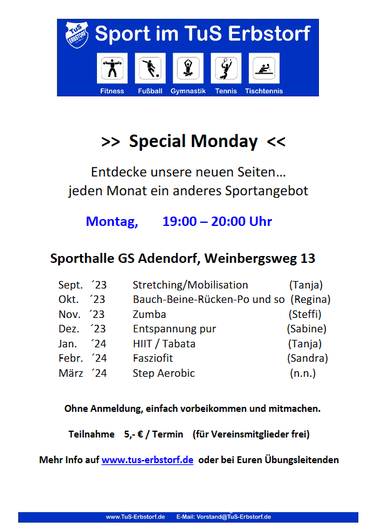 Ab 04.09.2023 starten wir mit unserem neuen Sportformat, dem Special Monday. Jeden Monat wird ein anderer Kurs angeboten. Probiere aus, was dir gefällt. Eine Vereinsmitgliedschaft ist nicht erforderlich.