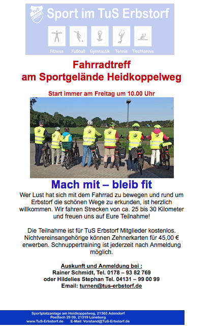 Der Fahrradtreff hat seinen ersten Geburtstag gefeiert. Es hat sich eine sehr harmonische Gruppe von ca. 15 Frauen und Männern gebildet, die sich auf jeden Freitag freuen.