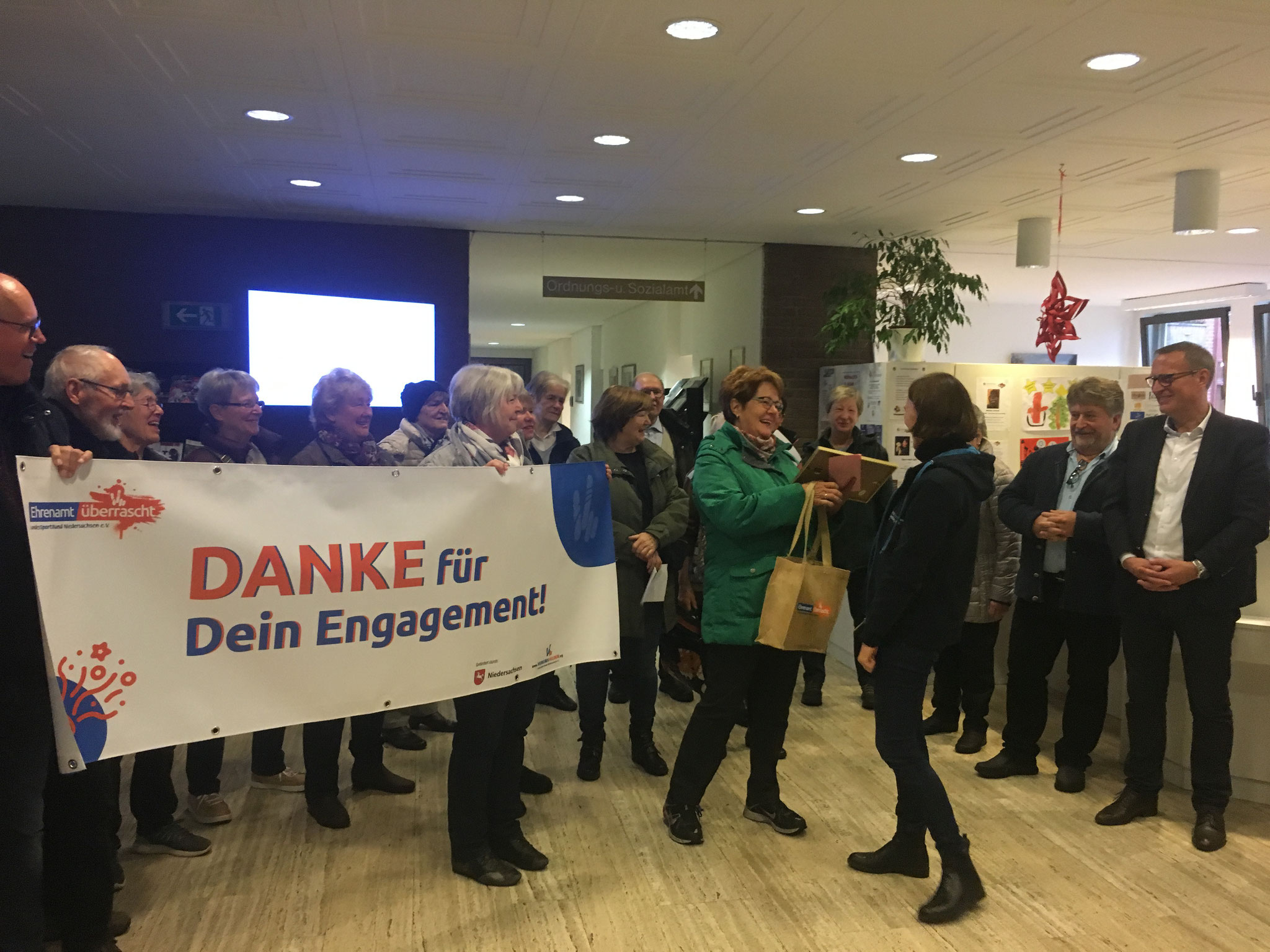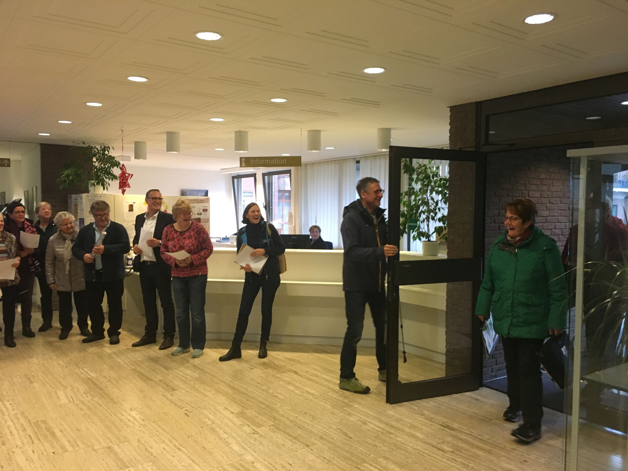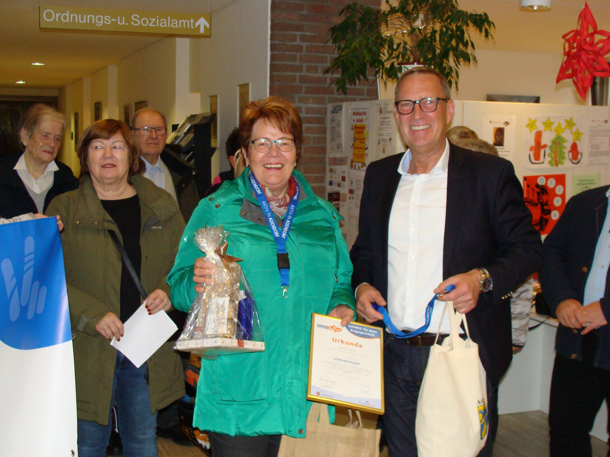 Jeden Mittwoch trifft sich die Fit- und Wandergruppe um 10.00 Uhr vor dem Adendorfer Rathaus um gemeinsam zu wandern. Doch diesen Mittwoch, 27.11.2019, war alles anders. Kurz vor 10.00 Uhr traf Hildelies mit ihrem Ehemann Manfred (der in die Aktion eingeweiht war) am Rathausplatz ein. Begrüßt wurde sie vom 1. Vorsitzenden, Mathias Heidbrock, der heute auch mal Sport am Mittwochvormittag machen wollte. Doch niemand war von der Gruppe anwesend, was Hildelies schon etwas überraschte. "Die sind bestimmt im Rathaus und warten bereits" so die etwas irritierte Hildelies. Tatsächlich, die gesamte Fit- und Wandergruppe und viele Teilnehmer/innen aus ihren anderen Gruppen warteten auf sie und empfingen sie mit einem "Dankeschönlied". Danach wurde die Konfetti-Kanone gezündet. Überraschung gelungen. Zu den Gratulanten zählten Anke Frommann vom KSB Lüneburg, die die Aktion zusammen mit Patryk Kröger vom KSB möglich gemacht haben. Auch Adendorfs Bürgermeister Thomas Maack ließ es sich nicht nehmen, Hildelies zu gratulieren.