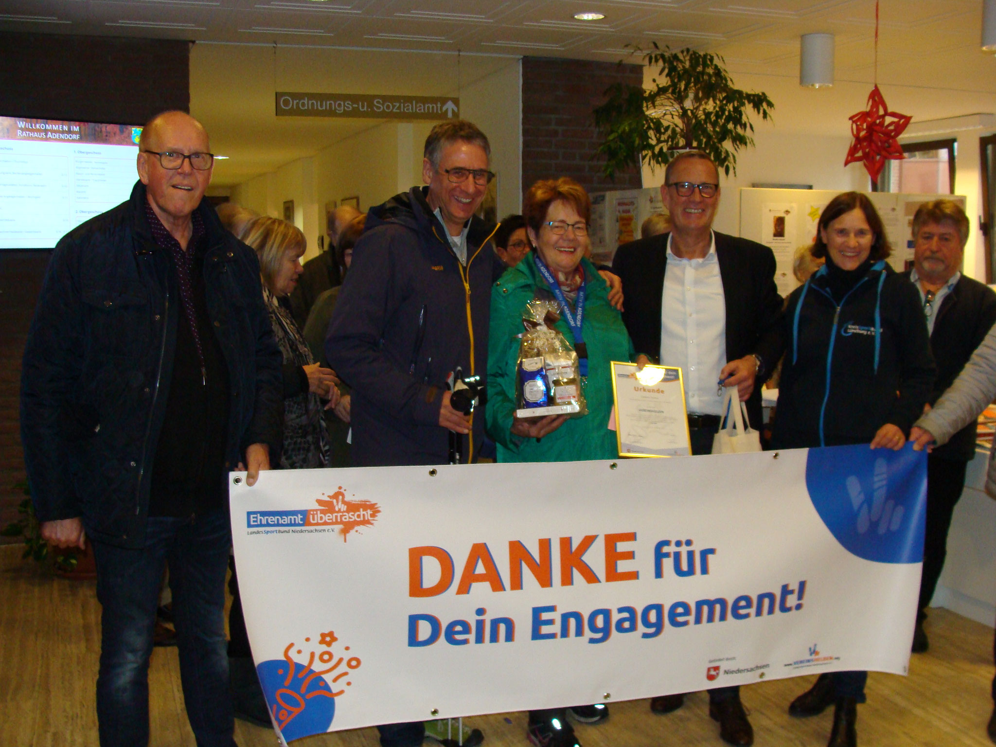 Unsere Abteilungsleiterin für Fitness und Gesundheitssport, Hildelies Stephan, wurde heute Vormittag im Rahmen der vom Landessportbund Niedersachsen initiierten Aktion "Ehrenamt überrascht" wirklich überrascht. Bei dieser Aktion geht es darum, dass Engagierte im Sportverein wertgeschätzt und in der Öffentlichkeit sichtbar gemacht werden.