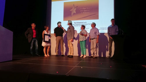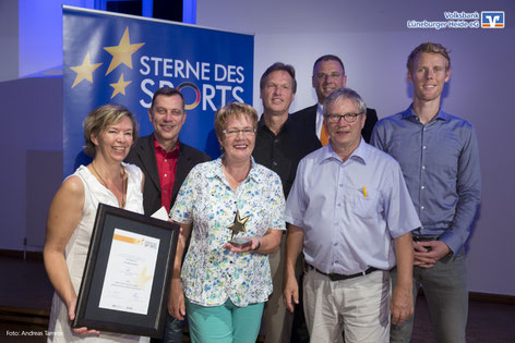 Bei der Preisverleihung des Vereinswettbewerbs "Sterne des Sports" in der Lüneburger Ritterakademie hat der TuS Erbstorf den großen Stern des Sports in Bronze 2016 gewonnen. Kein Geringerer als Jonas Reckermann, der Olympiasieger 2012 im Beachvolleyball, ehrte den TuS Erbstorf zum Kreissieger im Landkreis Lüneburg. Mit der Auszeichnung ist ein Preisgeld von 1.500 Euro verbunden sowie die Qualifikation für den niedersächsischen Landesentscheid, der Ende November in Hannover stattfindet. Aus allen Landes-Ersten wird im Frühjahr 2017 der Bundessieger in Berlin für den goldenen Stern ermittelt.