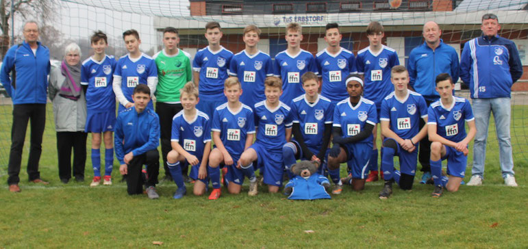 Hintere Reihe von Links: Trainer Martin H.,  Betreuerin Ingrid W., Nils, Nick, Luis, Hans, Ben, Jannik, Olli, Maxi, Trainer Sebastian L.,  Betreuer Henry H.