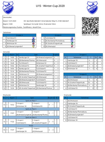 Am Nachmittag dann das von allen mit Spannung erwartete Turnier der U15 Junioren unter Beteiligung des Hamburger SV. Gespielt wurde in zwei Vierergruppen. Hier setzte sich der HSV mit einem knappen 1:0 Sieg gegen den gastgebenden TuS Erbstorf I durch und sicherte sich somit vor dem TuS Erbstorf den Gruppensieg. In der Gruppe zwei gelang der JSG Jlmenautal der Gruppensieg. In einem spannenden Finale konnte die JSG Ilmenautal den großen Turnierfavoriten HSV mit 3:2 bezwingen. Der TuS Erbstorf I wurde vierter und die zweite Mannschaft wurde siebter.