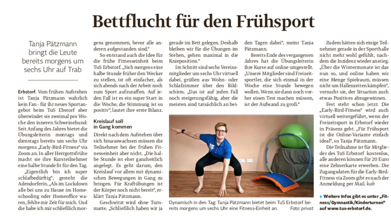 Dieses Fitnessangebot für Frühaufsteher und solche, die es werden wollen, findet ausschließlich online statt. Die Zugangsdaten für die Teilnahme bekommt ihr direkt von Übungsleiterin Tanja.
